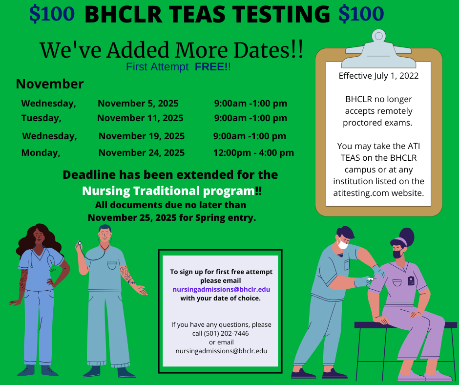 To sign up for your free first attempt, please email nursingadmissions@bhclr.edu with your date of choice. To sign up and pay for all other test dates or additional attempts, please click the link below.